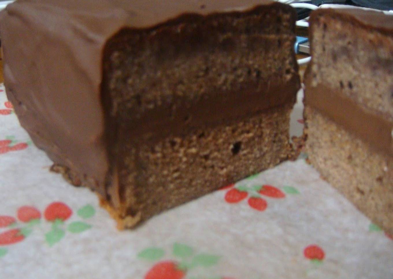 - Put back the part which would be the bottom back in the cake pan. Pour the creamy chocolate from step 6 and place the other half of cake on. Cover with a cellophane wrap and let it chill in the refrigerator.